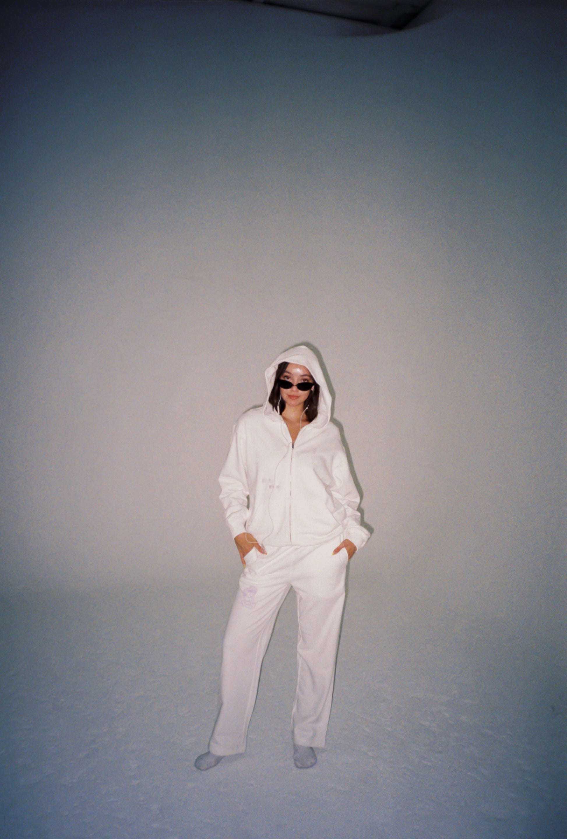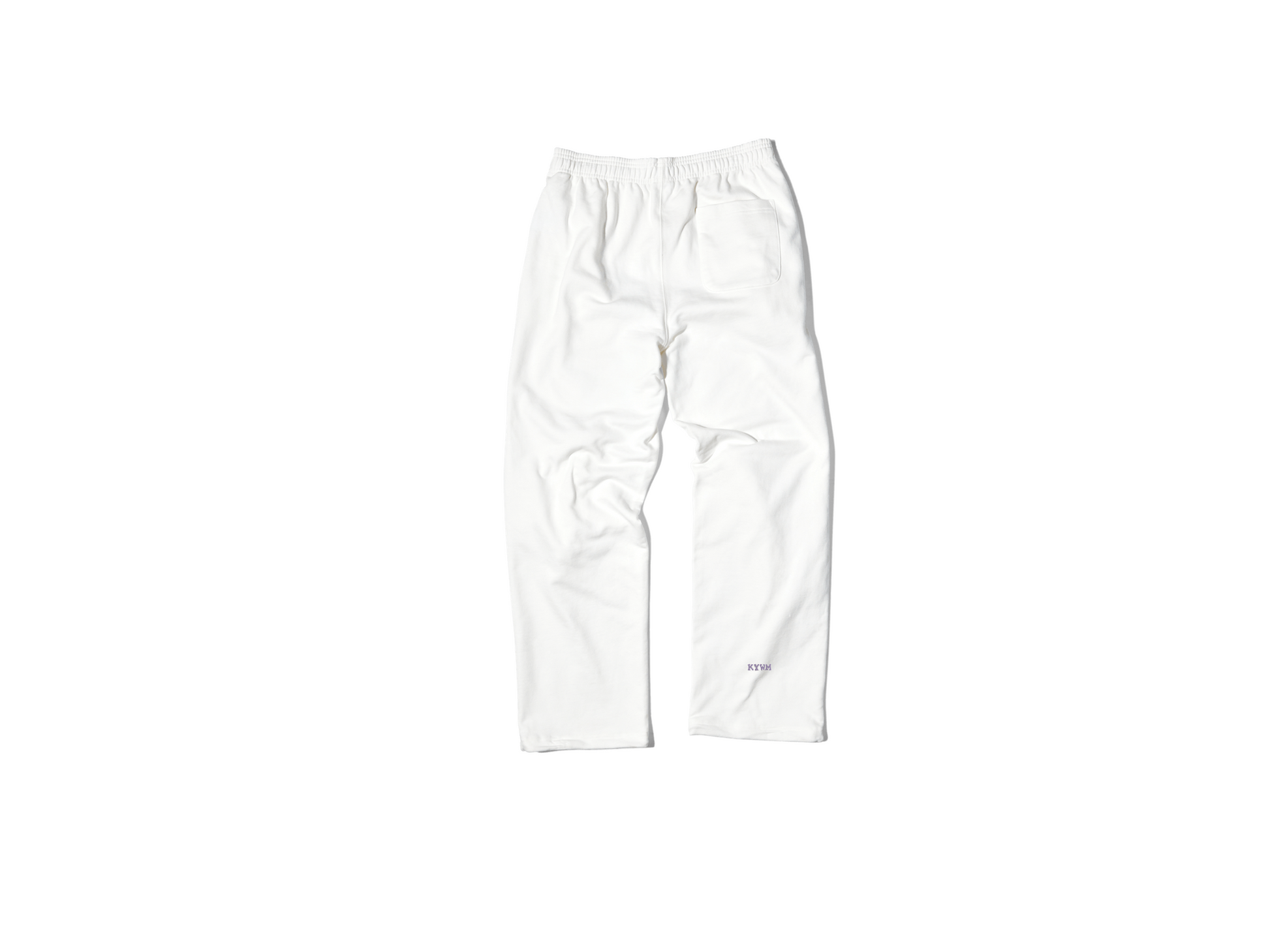 ‘Signature Afternoon’ sweatpant in white. Durable heavy-weight but soft fleece. Printed and embroidered locally.