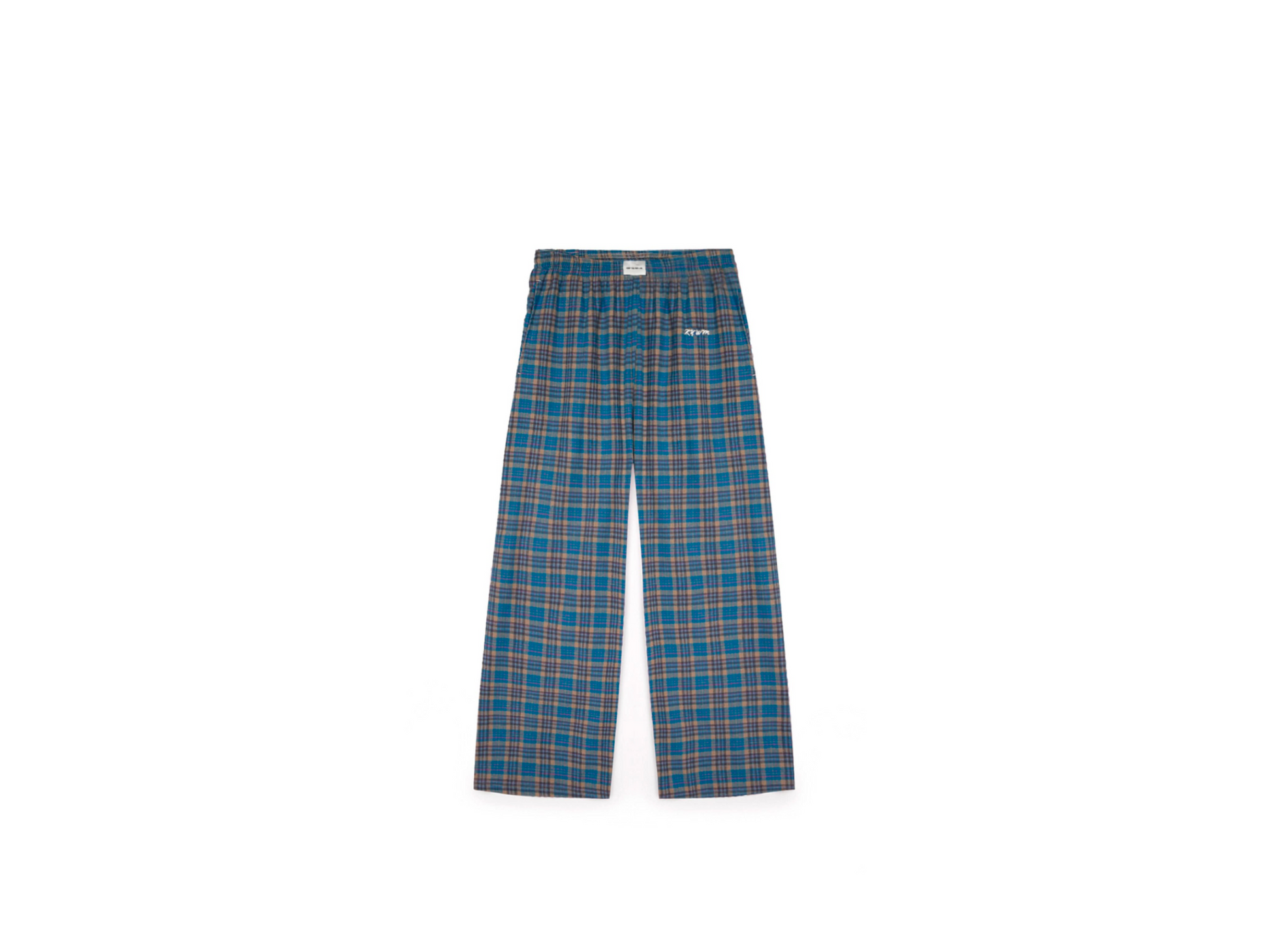 ‘Signature’ flannel lounge pant in BLUE/BEIGE/PNK PLAID. This unisex style features 2 side pockets, 1 back pocket and an adjustable drawcord waist. Embroidered locally.