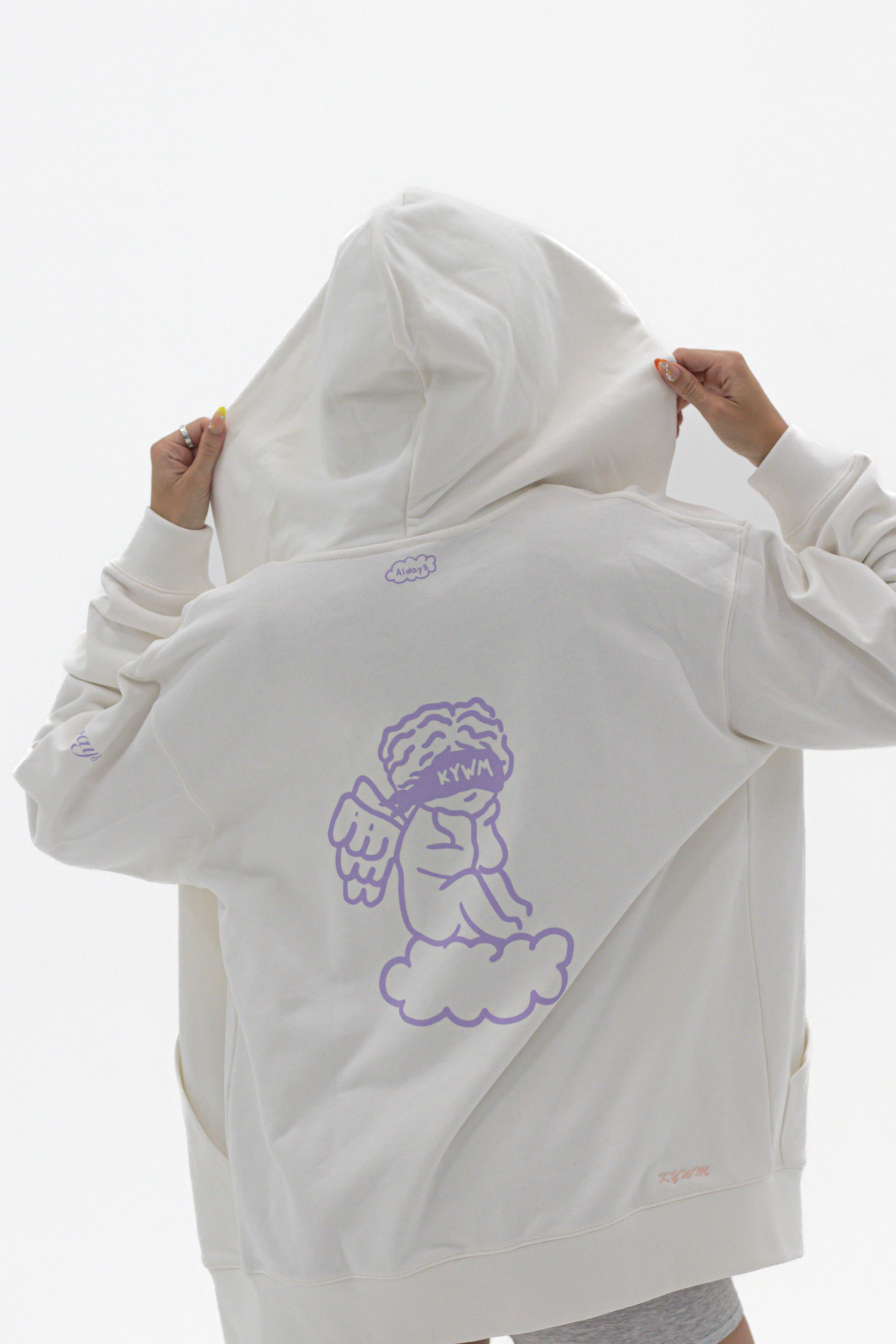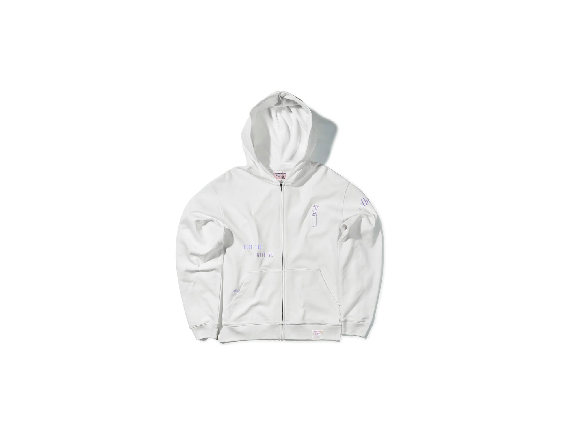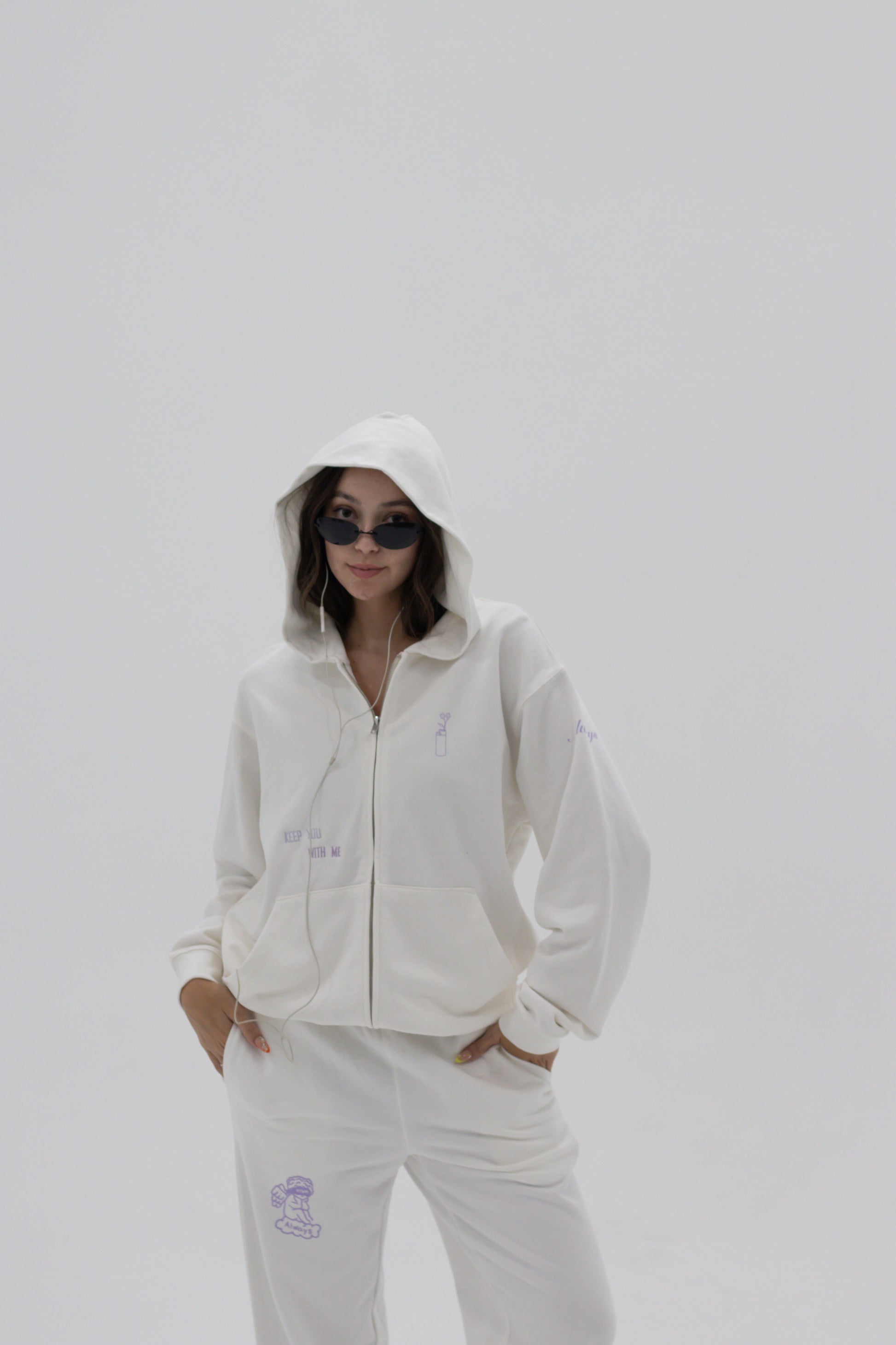 White zip hoodie with a seamless hood, chrome zipper and a slightly oversized fit, it wins over all the hearts of those who wear it. Pairs well with the 'Afternoon’ sweatpant. Printed and embroidered locally.